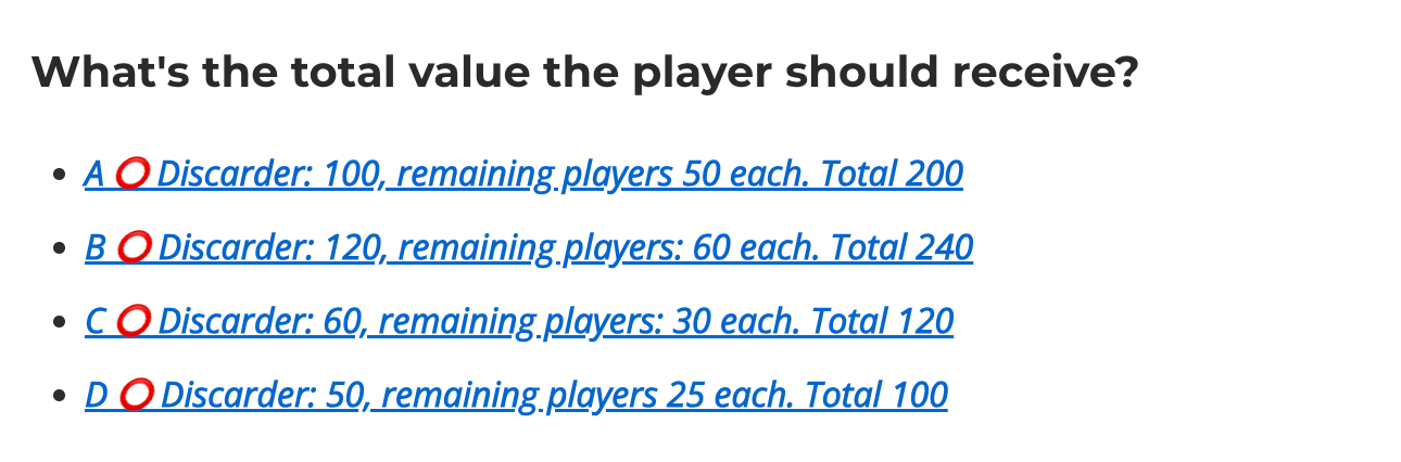 ⬜️⬜️⬜️⬜️⬜️⬜️ D ⭕️ Discarder: 50, remaining players 25 each. Total 100