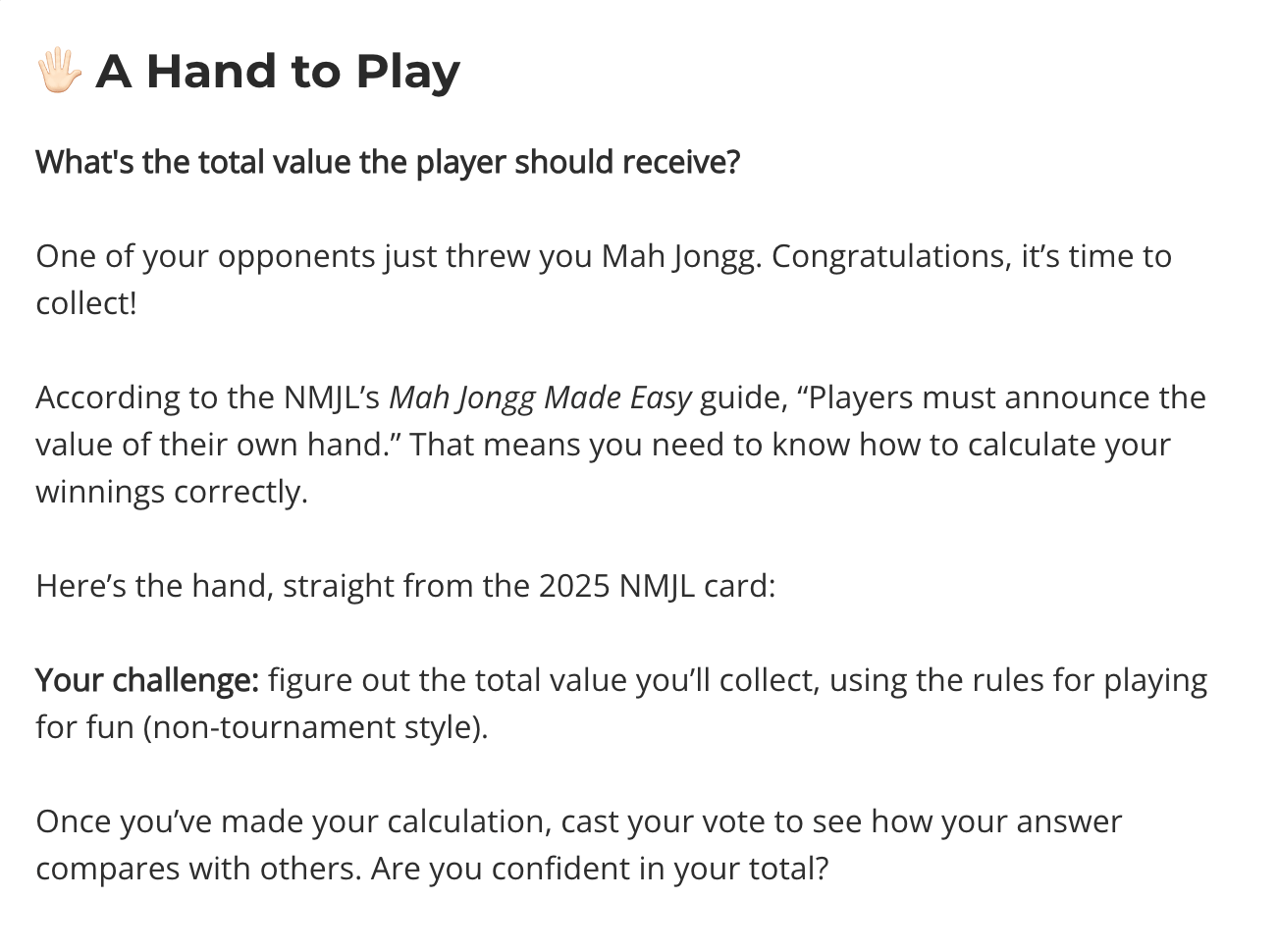 Key Takeaway: Always start with the correct hand and its base value, then apply the bonuses in order. Don’t forget the Joker-free bonus, it makes a big difference in your total!So, how’d you do? Feeling like a Mah Jongg Master or do you need some practice? CLICK HERE to sign up for our live practice sessions over Zoom!