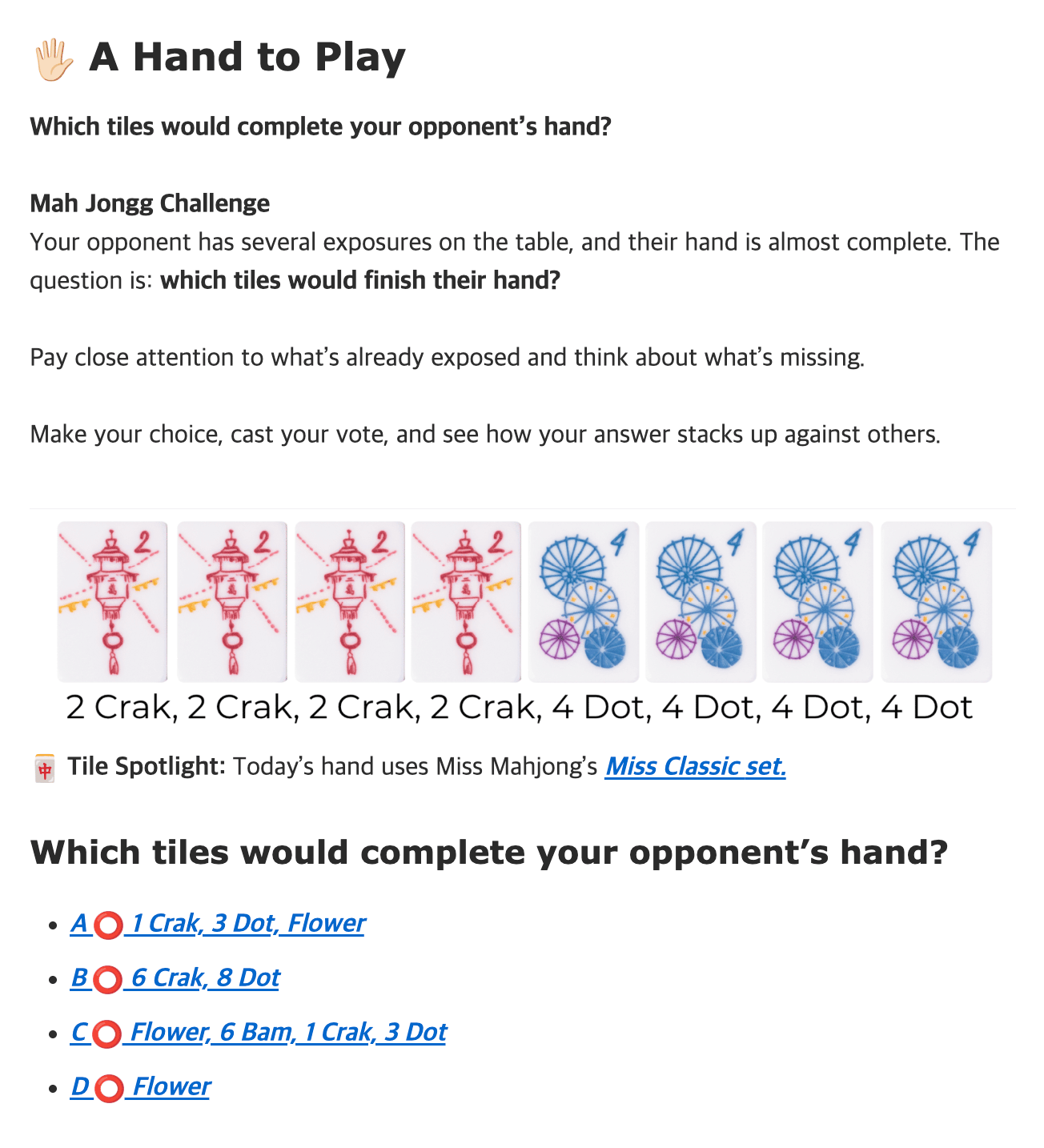 A Flower could give Mah Jongg, but it’s not the only risky tile needed to complete the hand.